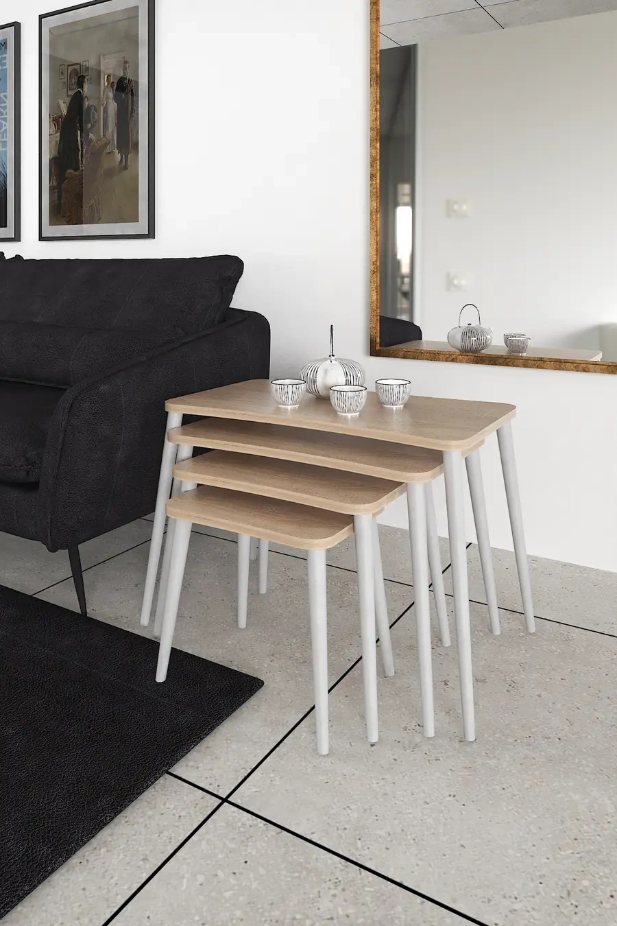 Selen 4lü Zigon Sehpa Ahşap Beyaz Ayaklı Salon Seti Çay Sehpası Sonomo