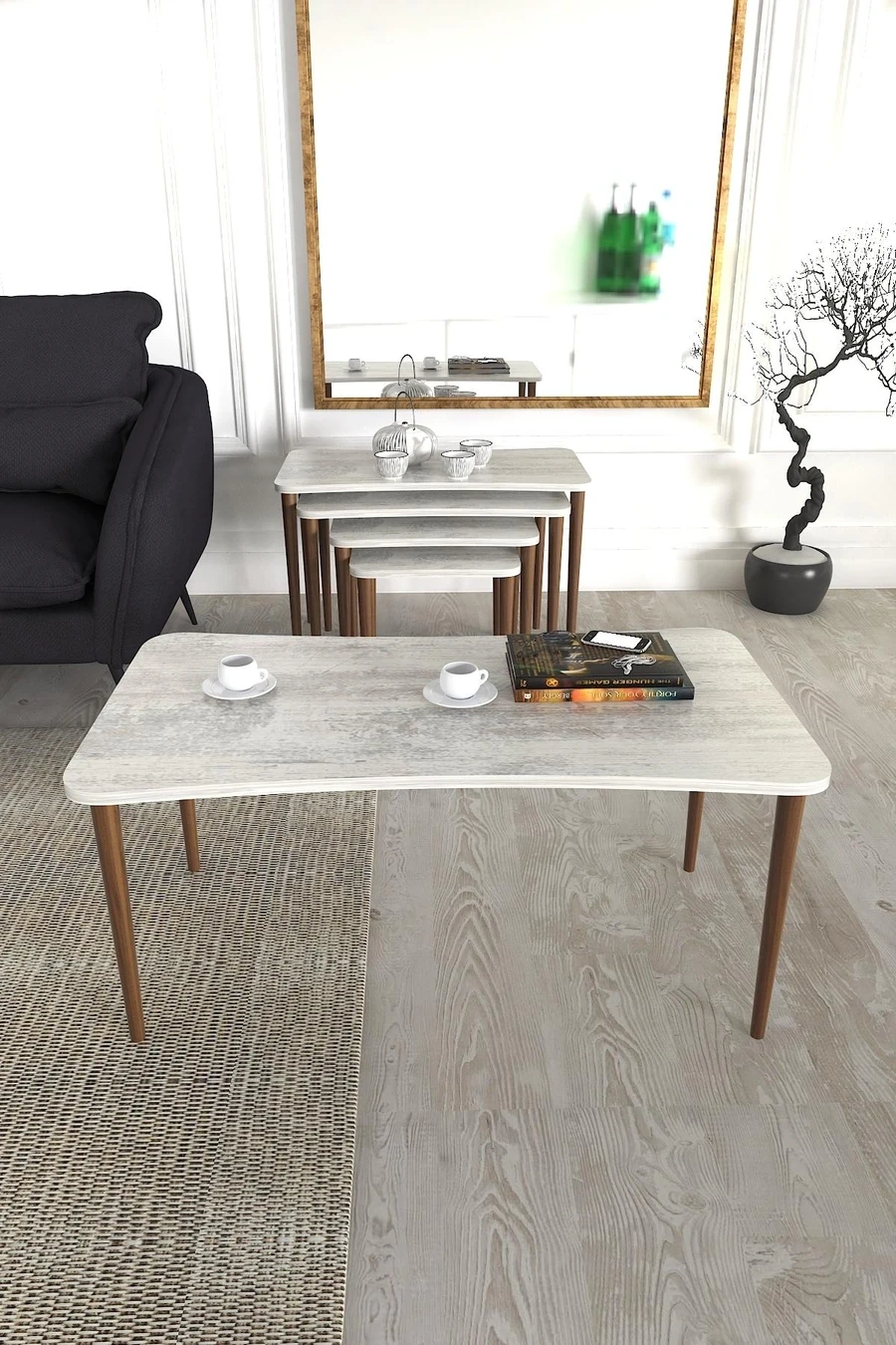 Esma Orta Sehpa Ve Zigon Sehpa 4'lü Ahşap Ayaklı Salon Seti Sehpa Beyaz Mermer Desenli