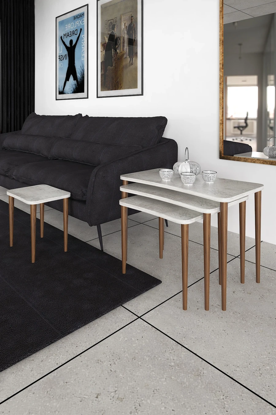 Selena 4lü Zigon Sehpa Ahşap Ayaklı Salon Seti Çay Sehpası Beyaz Mermer